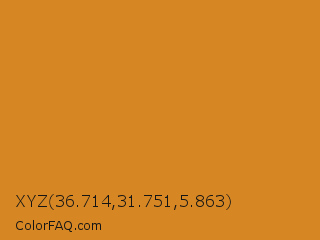 XYZ 36.714,31.751,5.863 Color is a normal orange color and the nearest color is Brandy Punch #cd8429. Hex code #d68724 and RGB value is rgb(214,135,36). In RGB color space, this color is composed of 84% red, 53% green, 14% blue, In CMYK color space, this color is composed of 0% cyan, 37% magenta, 83% yellow , 16% black , In HSL color space, this color has a hue angle of 33° , 71% saturation and 49% lightness.