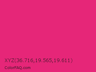 XYZ 36.716,19.565,19.611 Color is a normal rose color and the nearest color is Razzmatazz #e3256b. Hex code #e62678 and RGB value is rgb(230,38,120). In RGB color space, this color is composed of 90% red, 15% green, 47% blue, In CMYK color space, this color is composed of 0% cyan, 83% magenta, 48% yellow , 10% black , In HSL color space, this color has a hue angle of 334° , 79% saturation and 53% lightness.
