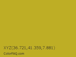 XYZ 36.721,41.359,7.881 Color is a normal yellow color and the nearest color is Hokey Pokey #c8a528. Hex code #beae26 and RGB value is rgb(190,174,38). In RGB color space, this color is composed of 75% red, 68% green, 15% blue, In CMYK color space, this color is composed of 0% cyan, 8% magenta, 80% yellow , 25% black , In HSL color space, this color has a hue angle of 54° , 67% saturation and 45% lightness.
