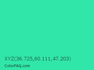 XYZ 36.725,60.111,47.203 Color is a normal green color and the nearest color is Eucalyptus #44d7a8. Hex code #31e6a9 and RGB value is rgb(49,230,169). In RGB color space, this color is composed of 19% red, 90% green, 66% blue, In CMYK color space, this color is composed of 79% cyan, 0% magenta, 27% yellow , 10% black , In HSL color space, this color has a hue angle of 160° , 78% saturation and 55% lightness.