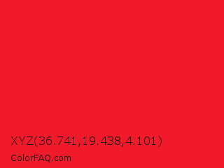 XYZ 36.741,19.438,4.101 Color is a normal red color and the nearest color is Red Pigment #ed1c24. Hex code #f01a2b and RGB value is rgb(240,26,43). In RGB color space, this color is composed of 94% red, 10% green, 17% blue, In CMYK color space, this color is composed of 0% cyan, 89% magenta, 82% yellow , 6% black , In HSL color space, this color has a hue angle of 355° , 88% saturation and 52% lightness.