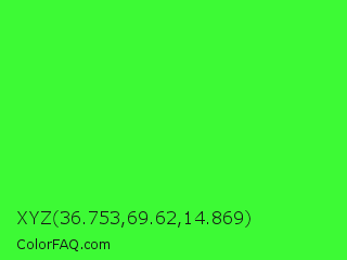 XYZ 36.753,69.62,14.869 Color is a normal green color and the nearest color is Neon Green #39ff14. Hex code #3dfa35 and RGB value is rgb(61,250,53). In RGB color space, this color is composed of 24% red, 98% green, 21% blue, In CMYK color space, this color is composed of 76% cyan, 0% magenta, 79% yellow , 2% black , In HSL color space, this color has a hue angle of 118° , 95% saturation and 59% lightness.