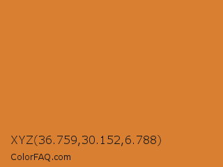 XYZ 36.759,30.152,6.788 Color is a normal orange color and the nearest color is Bronze #cd7f32. Hex code #d97f31 and RGB value is rgb(217,127,49). In RGB color space, this color is composed of 85% red, 50% green, 19% blue, In CMYK color space, this color is composed of 0% cyan, 41% magenta, 77% yellow , 15% black , In HSL color space, this color has a hue angle of 28° , 69% saturation and 52% lightness.