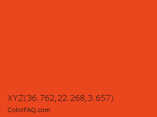 XYZ 36.762,22.268,3.657 Color is a normal red color and the nearest color is Pomegranate #f34723. Hex code #eb471f and RGB value is rgb(235,71,31). In RGB color space, this color is composed of 92% red, 28% green, 12% blue, In CMYK color space, this color is composed of 0% cyan, 70% magenta, 87% yellow , 8% black , In HSL color space, this color has a hue angle of 12° , 84% saturation and 52% lightness.