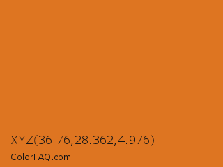 XYZ 36.76,28.362,4.976 Color is a normal orange color and the nearest color is Tango #ed7a1c. Hex code #de7521 and RGB value is rgb(222,117,33). In RGB color space, this color is composed of 87% red, 46% green, 13% blue, In CMYK color space, this color is composed of 0% cyan, 47% magenta, 85% yellow , 13% black , In HSL color space, this color has a hue angle of 27° , 74% saturation and 50% lightness.