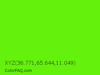 XYZ 36.771,65.644,11.049 Color is a normal green color and the nearest color is Bright Green #66ff00. Hex code #64f10b and RGB value is rgb(100,241,11). In RGB color space, this color is composed of 39% red, 95% green, 4% blue, In CMYK color space, this color is composed of 59% cyan, 0% magenta, 95% yellow , 5% black , In HSL color space, this color has a hue angle of 97° , 91% saturation and 49% lightness.