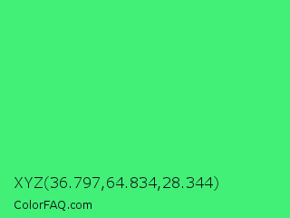 XYZ 36.797,64.834,28.344 Color is a normal green color and the nearest color is UFO Green #3cd070. Hex code #42f078 and RGB value is rgb(66,240,120). In RGB color space, this color is composed of 26% red, 94% green, 47% blue, In CMYK color space, this color is composed of 73% cyan, 0% magenta, 50% yellow , 6% black , In HSL color space, this color has a hue angle of 139° , 85% saturation and 60% lightness.