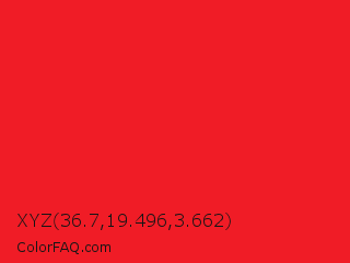 XYZ 36.7,19.496,3.662 Color is a normal red color and the nearest color is Red Pigment #ed1c24. Hex code #f01c26 and RGB value is rgb(240,28,38). In RGB color space, this color is composed of 94% red, 11% green, 15% blue, In CMYK color space, this color is composed of 0% cyan, 88% magenta, 84% yellow , 6% black , In HSL color space, this color has a hue angle of 357° , 88% saturation and 53% lightness.