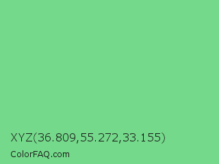 XYZ 36.809,55.272,33.155 Color is a light green color and the nearest color is Pastel Green #77dd77. Hex code #75d98b and RGB value is rgb(117,217,139). In RGB color space, this color is composed of 46% red, 85% green, 55% blue, In CMYK color space, this color is composed of 46% cyan, 0% magenta, 36% yellow , 15% black , In HSL color space, this color has a hue angle of 133° , 57% saturation and 65% lightness.
