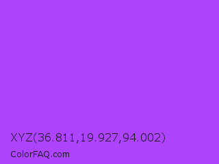 XYZ 36.811,19.927,94.002 Color is a light purple color and the nearest color is Navy Purple #9457eb. Hex code #ad43fc and RGB value is rgb(173,67,252). In RGB color space, this color is composed of 68% red, 26% green, 99% blue, In CMYK color space, this color is composed of 31% cyan, 73% magenta, 0% yellow , 1% black , In HSL color space, this color has a hue angle of 274° , 97% saturation and 63% lightness.