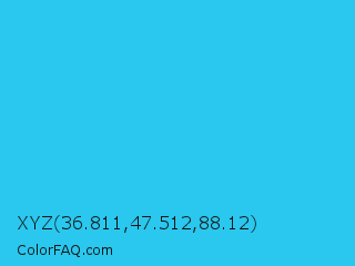XYZ 36.811,47.512,88.12 Color is a normal cyan color and the nearest color is Scooter #2ebfd4. Hex code #2ac7ee and RGB value is rgb(42,199,238). In RGB color space, this color is composed of 16% red, 78% green, 93% blue, In CMYK color space, this color is composed of 82% cyan, 16% magenta, 0% yellow , 7% black , In HSL color space, this color has a hue angle of 192° , 85% saturation and 55% lightness.