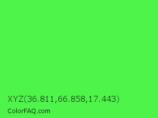 XYZ 36.811,66.858,17.443 Color is a light green color and the nearest color is Screamin Green #66ff66. Hex code #4ff44a and RGB value is rgb(79,244,74). In RGB color space, this color is composed of 31% red, 96% green, 29% blue, In CMYK color space, this color is composed of 68% cyan, 0% magenta, 70% yellow , 4% black , In HSL color space, this color has a hue angle of 118° , 89% saturation and 62% lightness.