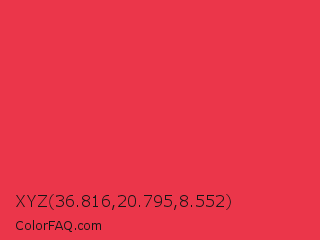 XYZ 36.816,20.795,8.552 Color is a normal red color and the nearest color is Desire #ea3c53. Hex code #eb364a and RGB value is rgb(235,54,74). In RGB color space, this color is composed of 92% red, 21% green, 29% blue, In CMYK color space, this color is composed of 0% cyan, 77% magenta, 69% yellow , 8% black , In HSL color space, this color has a hue angle of 353° , 82% saturation and 57% lightness.
