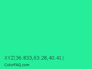 XYZ 36.833,63.28,40.41 Color is a normal green color and the nearest color is Shamrock #33cc99. Hex code #26ed99 and RGB value is rgb(38,237,153). In RGB color space, this color is composed of 15% red, 93% green, 60% blue, In CMYK color space, this color is composed of 84% cyan, 0% magenta, 35% yellow , 7% black , In HSL color space, this color has a hue angle of 155° , 85% saturation and 54% lightness.