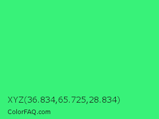 XYZ 36.834,65.725,28.834 Color is a normal green color and the nearest color is UFO Green #3cd070. Hex code #38f279 and RGB value is rgb(56,242,121). In RGB color space, this color is composed of 22% red, 95% green, 47% blue, In CMYK color space, this color is composed of 77% cyan, 0% magenta, 50% yellow , 5% black , In HSL color space, this color has a hue angle of 141° , 88% saturation and 58% lightness.
