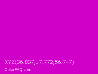 XYZ 36.837,17.772,56.747 Color is a normal magenta color and the nearest color is Deep Magenta #cc00cc. Hex code #d100c9 and RGB value is rgb(209,0,201). In RGB color space, this color is composed of 82% red, 0% green, 79% blue, In CMYK color space, this color is composed of 0% cyan, 100% magenta, 4% yellow , 18% black , In HSL color space, this color has a hue angle of 302° , 100% saturation and 41% lightness.