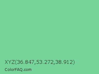 XYZ 36.847,53.272,38.912 Color is a light green color and the nearest color is Medium Aquamarine #66ddaa. Hex code #76d49a and RGB value is rgb(118,212,154). In RGB color space, this color is composed of 46% red, 83% green, 60% blue, In CMYK color space, this color is composed of 44% cyan, 0% magenta, 27% yellow , 17% black , In HSL color space, this color has a hue angle of 143° , 52% saturation and 65% lightness.