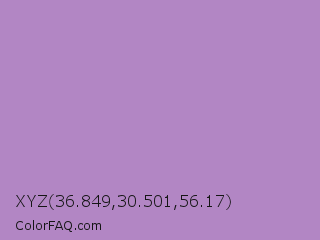 XYZ 36.849,30.501,56.17 Color is a light purple color and the nearest color is African Violet #b284be. Hex code #b286c4 and RGB value is rgb(178,134,196). In RGB color space, this color is composed of 70% red, 53% green, 77% blue, In CMYK color space, this color is composed of 9% cyan, 32% magenta, 0% yellow , 23% black , In HSL color space, this color has a hue angle of 283° , 34% saturation and 65% lightness.