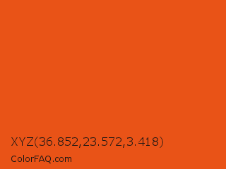 XYZ 36.852,23.572,3.418 Color is a normal orange color and the nearest color is Flame #e25822. Hex code #e95317 and RGB value is rgb(233,83,23). In RGB color space, this color is composed of 91% red, 33% green, 9% blue, In CMYK color space, this color is composed of 0% cyan, 64% magenta, 90% yellow , 9% black , In HSL color space, this color has a hue angle of 17° , 83% saturation and 50% lightness.