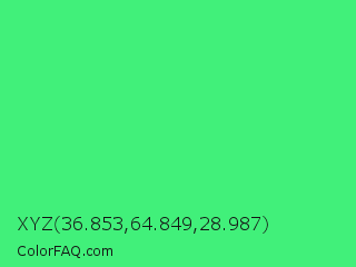 XYZ 36.853,64.849,28.987 Color is a normal green color and the nearest color is UFO Green #3cd070. Hex code #41f07a and RGB value is rgb(65,240,122). In RGB color space, this color is composed of 25% red, 94% green, 48% blue, In CMYK color space, this color is composed of 73% cyan, 0% magenta, 49% yellow , 6% black , In HSL color space, this color has a hue angle of 140° , 85% saturation and 60% lightness.