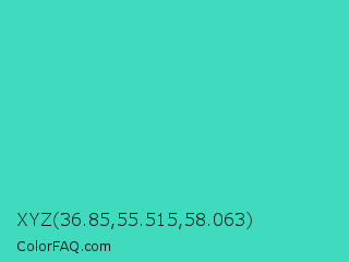 XYZ 36.85,55.515,58.063 Color is a normal cyan color and the nearest color is Turquoise #40e0d0. Hex code #40dbbf and RGB value is rgb(64,219,191). In RGB color space, this color is composed of 25% red, 86% green, 75% blue, In CMYK color space, this color is composed of 71% cyan, 0% magenta, 13% yellow , 14% black , In HSL color space, this color has a hue angle of 169° , 68% saturation and 55% lightness.