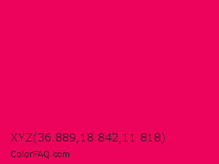 XYZ 36.889,18.842,11.818 Color is a normal rose color and the nearest color is Razzmatazz Crayola #e30b5c. Hex code #ed035c and RGB value is rgb(237,3,92). In RGB color space, this color is composed of 93% red, 1% green, 36% blue, In CMYK color space, this color is composed of 0% cyan, 99% magenta, 61% yellow , 7% black , In HSL color space, this color has a hue angle of 337° , 98% saturation and 47% lightness.