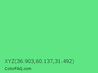 XYZ 36.903,60.137,31.492 Color is a light green color and the nearest color is Very Light Malachite Green #64e986. Hex code #5fe584 and RGB value is rgb(95,229,132). In RGB color space, this color is composed of 37% red, 90% green, 52% blue, In CMYK color space, this color is composed of 59% cyan, 0% magenta, 42% yellow , 10% black , In HSL color space, this color has a hue angle of 137° , 72% saturation and 64% lightness.