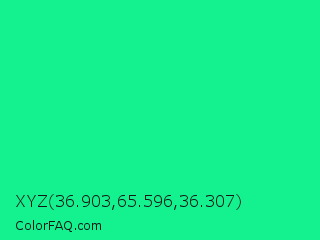 XYZ 36.903,65.596,36.307 Color is a normal green color and the nearest color is Medium Spring Green #00fa9a. Hex code #13f28e and RGB value is rgb(19,242,142). In RGB color space, this color is composed of 7% red, 95% green, 56% blue, In CMYK color space, this color is composed of 92% cyan, 0% magenta, 41% yellow , 5% black , In HSL color space, this color has a hue angle of 153° , 90% saturation and 51% lightness.