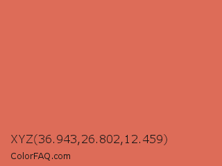 XYZ 36.943,26.802,12.459 Color is a light red color and the nearest color is Terracotta #e2725b. Hex code #dd6c58 and RGB value is rgb(221,108,88). In RGB color space, this color is composed of 87% red, 42% green, 35% blue, In CMYK color space, this color is composed of 0% cyan, 51% magenta, 60% yellow , 13% black , In HSL color space, this color has a hue angle of 9° , 66% saturation and 61% lightness.