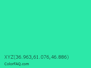 XYZ 36.963,61.076,46.886 Color is a normal green color and the nearest color is Eucalyptus #44d7a8. Hex code #2ce8a8 and RGB value is rgb(44,232,168). In RGB color space, this color is composed of 17% red, 91% green, 66% blue, In CMYK color space, this color is composed of 81% cyan, 0% magenta, 28% yellow , 9% black , In HSL color space, this color has a hue angle of 160° , 80% saturation and 54% lightness.