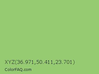 XYZ 36.971,50.411,23.701 Color is a light green color and the nearest color is Pistachio #93c572. Hex code #96cb72 and RGB value is rgb(150,203,114). In RGB color space, this color is composed of 59% red, 80% green, 45% blue, In CMYK color space, this color is composed of 26% cyan, 0% magenta, 44% yellow , 20% black , In HSL color space, this color has a hue angle of 96° , 46% saturation and 62% lightness.