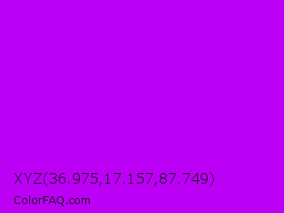 XYZ 36.975,17.157,87.749 Color is a normal purple color and the nearest color is Electric Purple #bf00ff. Hex code #bb00f5 and RGB value is rgb(187,0,245). In RGB color space, this color is composed of 73% red, 0% green, 96% blue, In CMYK color space, this color is composed of 24% cyan, 100% magenta, 0% yellow , 4% black , In HSL color space, this color has a hue angle of 286° , 100% saturation and 48% lightness.