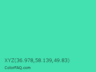 XYZ 36.978,58.139,49.83 Color is a normal green color and the nearest color is Eucalyptus #44d7a8. Hex code #43e1af and RGB value is rgb(67,225,175). In RGB color space, this color is composed of 26% red, 88% green, 69% blue, In CMYK color space, this color is composed of 70% cyan, 0% magenta, 22% yellow , 12% black , In HSL color space, this color has a hue angle of 161° , 72% saturation and 57% lightness.