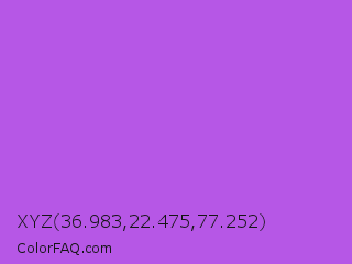 XYZ 36.983,22.475,77.252 Color is a light purple color and the nearest color is Medium Orchid #ba55d3. Hex code #b657e6 and RGB value is rgb(182,87,230). In RGB color space, this color is composed of 71% red, 34% green, 90% blue, In CMYK color space, this color is composed of 21% cyan, 62% magenta, 0% yellow , 10% black , In HSL color space, this color has a hue angle of 280° , 74% saturation and 62% lightness.