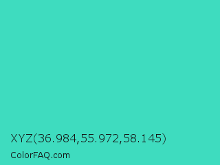 XYZ 36.984,55.972,58.145 Color is a normal cyan color and the nearest color is Turquoise #40e0d0. Hex code #3edcbf and RGB value is rgb(62,220,191). In RGB color space, this color is composed of 24% red, 86% green, 75% blue, In CMYK color space, this color is composed of 72% cyan, 0% magenta, 13% yellow , 14% black , In HSL color space, this color has a hue angle of 169° , 69% saturation and 55% lightness.