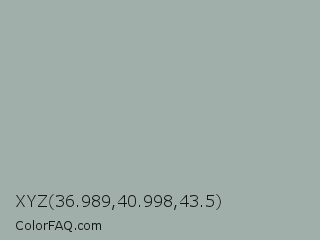 XYZ 36.989,40.998,43.5 Color is a light green color and the nearest color is Edward #a2aeab. Hex code #a0afa9 and RGB value is rgb(160,175,169). In RGB color space, this color is composed of 63% red, 69% green, 66% blue, In CMYK color space, this color is composed of 9% cyan, 0% magenta, 3% yellow , 31% black , In HSL color space, this color has a hue angle of 156° , 9% saturation and 66% lightness.