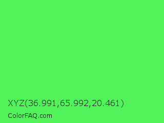 XYZ 36.991,65.992,20.461 Color is a light green color and the nearest color is Screamin Green #66ff66. Hex code #51f25a and RGB value is rgb(81,242,90). In RGB color space, this color is composed of 32% red, 95% green, 35% blue, In CMYK color space, this color is composed of 67% cyan, 0% magenta, 63% yellow , 5% black , In HSL color space, this color has a hue angle of 123° , 86% saturation and 63% lightness.