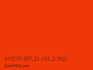 XYZ 37.007,21.101,2.352 Color is a normal red color and the nearest color is Coquelicot #ff3800. Hex code #ef3708 and RGB value is rgb(239,55,8). In RGB color space, this color is composed of 94% red, 22% green, 3% blue, In CMYK color space, this color is composed of 0% cyan, 77% magenta, 97% yellow , 6% black , In HSL color space, this color has a hue angle of 12° , 94% saturation and 48% lightness.