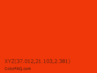 XYZ 37.012,21.103,2.381 Color is a normal red color and the nearest color is Coquelicot #ff3800. Hex code #ef3709 and RGB value is rgb(239,55,9). In RGB color space, this color is composed of 94% red, 22% green, 4% blue, In CMYK color space, this color is composed of 0% cyan, 77% magenta, 96% yellow , 6% black , In HSL color space, this color has a hue angle of 12° , 93% saturation and 49% lightness.