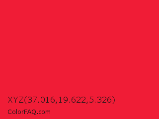 XYZ 37.016,19.622,5.326 Color is a normal red color and the nearest color is Imperial Red #ed2939. Hex code #f01c36 and RGB value is rgb(240,28,54). In RGB color space, this color is composed of 94% red, 11% green, 21% blue, In CMYK color space, this color is composed of 0% cyan, 88% magenta, 78% yellow , 6% black , In HSL color space, this color has a hue angle of 353° , 88% saturation and 53% lightness.