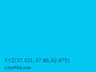 XYZ 37.021,47.86,92.875 Color is a normal cyan color and the nearest color is Vivid Sky Blue #00ccff. Hex code #03c8f4 and RGB value is rgb(3,200,244). In RGB color space, this color is composed of 1% red, 78% green, 96% blue, In CMYK color space, this color is composed of 99% cyan, 18% magenta, 0% yellow , 4% black , In HSL color space, this color has a hue angle of 191° , 98% saturation and 48% lightness.