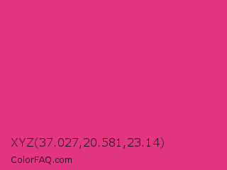 XYZ 37.027,20.581,23.14 Color is a normal rose color and the nearest color is Cerise Pink #ec3b83. Hex code #e33682 and RGB value is rgb(227,54,130). In RGB color space, this color is composed of 89% red, 21% green, 51% blue, In CMYK color space, this color is composed of 0% cyan, 76% magenta, 43% yellow , 11% black , In HSL color space, this color has a hue angle of 334° , 76% saturation and 55% lightness.