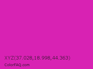 XYZ 37.028,18.998,44.363 Color is a normal magenta color and the nearest color is Frostbite #e936a7. Hex code #d822b3 and RGB value is rgb(216,34,179). In RGB color space, this color is composed of 85% red, 13% green, 70% blue, In CMYK color space, this color is composed of 0% cyan, 84% magenta, 17% yellow , 15% black , In HSL color space, this color has a hue angle of 312° , 73% saturation and 49% lightness.