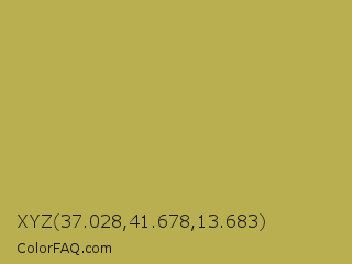 XYZ 37.028,41.678,13.683 Color is a normal yellow color and the nearest color is Olive Green #b5b35c. Hex code #baaf50 and RGB value is rgb(186,175,80). In RGB color space, this color is composed of 73% red, 69% green, 31% blue, In CMYK color space, this color is composed of 0% cyan, 6% magenta, 57% yellow , 27% black , In HSL color space, this color has a hue angle of 54° , 43% saturation and 52% lightness.