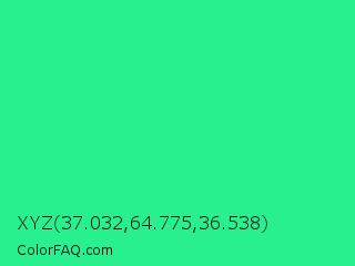 XYZ 37.032,64.775,36.538 Color is a normal green color and the nearest color is Shamrock #33cc99. Hex code #29f08f and RGB value is rgb(41,240,143). In RGB color space, this color is composed of 16% red, 94% green, 56% blue, In CMYK color space, this color is composed of 83% cyan, 0% magenta, 40% yellow , 6% black , In HSL color space, this color has a hue angle of 151° , 87% saturation and 55% lightness.