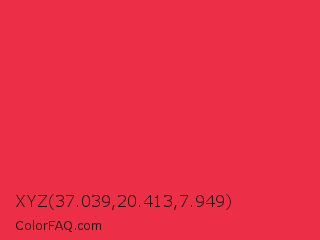 XYZ 37.039,20.413,7.949 Color is a normal red color and the nearest color is Amaranth #e52b50. Hex code #ed2e47 and RGB value is rgb(237,46,71). In RGB color space, this color is composed of 93% red, 18% green, 28% blue, In CMYK color space, this color is composed of 0% cyan, 81% magenta, 70% yellow , 7% black , In HSL color space, this color has a hue angle of 352° , 84% saturation and 55% lightness.