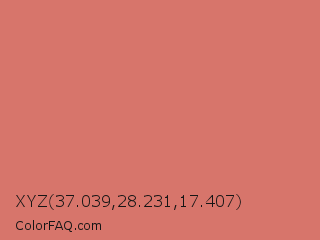 XYZ 37.039,28.231,17.407 Color is a light red color and the nearest color is Japonica #d87c63. Hex code #d7756b and RGB value is rgb(215,117,107). In RGB color space, this color is composed of 84% red, 46% green, 42% blue, In CMYK color space, this color is composed of 0% cyan, 46% magenta, 50% yellow , 16% black , In HSL color space, this color has a hue angle of 6° , 57% saturation and 63% lightness.