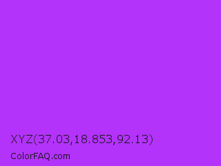 XYZ 37.03,18.853,92.13 Color is a normal purple color and the nearest color is Veronica #a020f0. Hex code #b333fa and RGB value is rgb(179,51,250). In RGB color space, this color is composed of 70% red, 20% green, 98% blue, In CMYK color space, this color is composed of 28% cyan, 80% magenta, 0% yellow , 2% black , In HSL color space, this color has a hue angle of 279° , 95% saturation and 59% lightness.