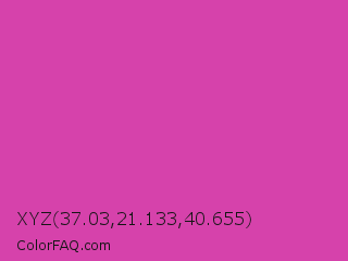 XYZ 37.03,21.133,40.655 Color is a normal magenta color and the nearest color is Frostbite #e936a7. Hex code #d642ab and RGB value is rgb(214,66,171). In RGB color space, this color is composed of 84% red, 26% green, 67% blue, In CMYK color space, this color is composed of 0% cyan, 69% magenta, 20% yellow , 16% black , In HSL color space, this color has a hue angle of 317° , 64% saturation and 55% lightness.