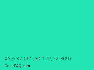 XYZ 37.061,60.172,52.309 Color is a normal cyan color and the nearest color is Turquoise PWG #30d5c8. Hex code #21e6b3 and RGB value is rgb(33,230,179). In RGB color space, this color is composed of 13% red, 90% green, 70% blue, In CMYK color space, this color is composed of 86% cyan, 0% magenta, 22% yellow , 10% black , In HSL color space, this color has a hue angle of 164° , 80% saturation and 52% lightness.